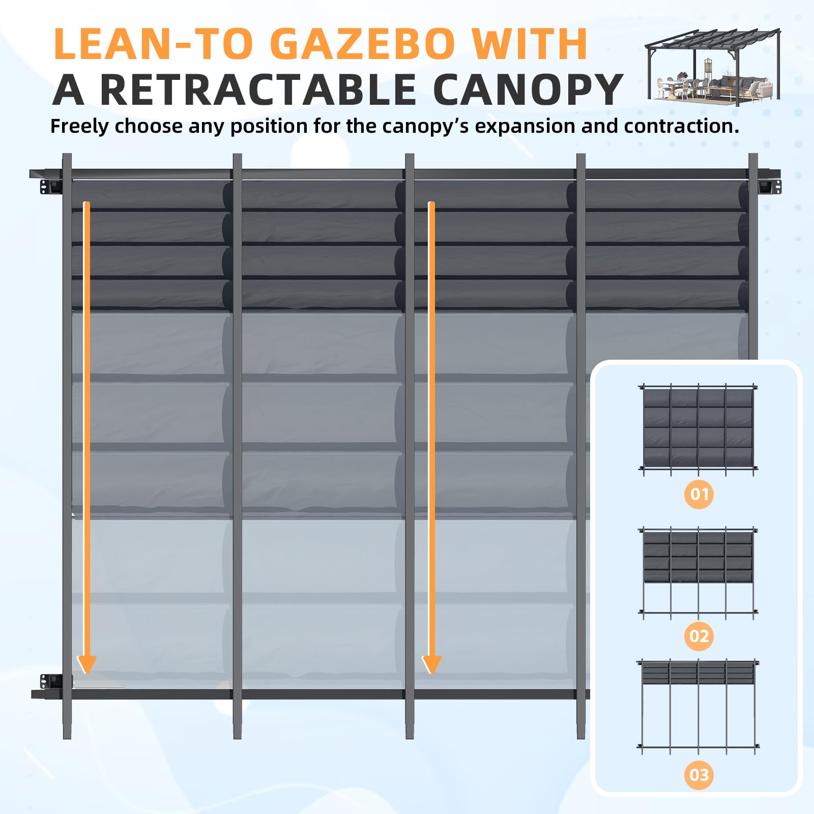 Transform your patio into a stylish and functional oasis with the AECOJOY 14x10 gazebo, designed for those who crave comfort and versatility in their outdoor spaces. This pergola with retractable canopy allows you to easily adjust the shade throughout the day, giving you full control over sunlight and privacy. Crafted from a durable powder-coated aluminum frame, this metal gazebo offers excellent weather resistance and long-lasting performance. Its sleek design makes it an ideal wall mounted gazebo solution, saving space while enhancing your backyard’s style. Whether you're hosting a summer barbecue, relaxing with a book, or enjoying an evening gathering, this retractable roof pergola adapts to all your outdoor activities. Plus, if you're searching for gazebos on clearance, this large gazebo delivers exceptional quality at an unbeatable value, offering both beauty and practicality for years to come.